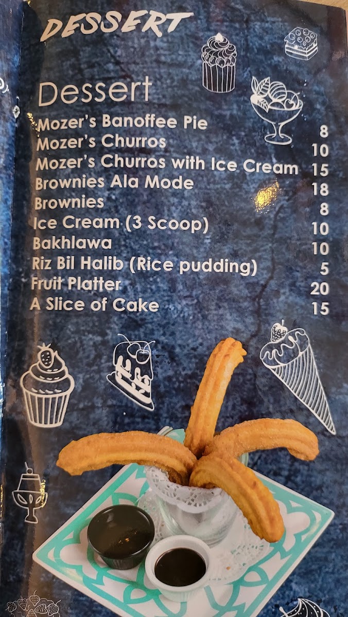 - Desserts: Includes items like churros fawakee with ice cream and pavlova cake.