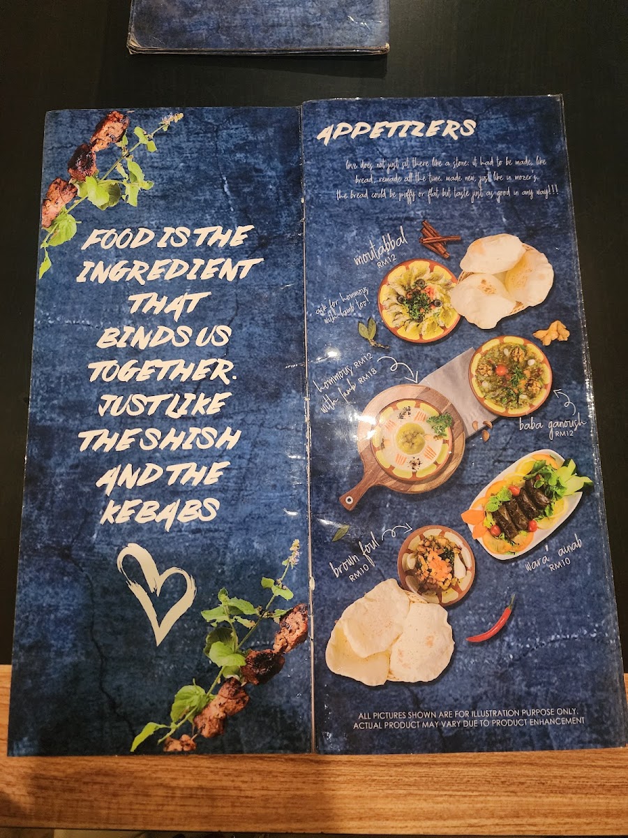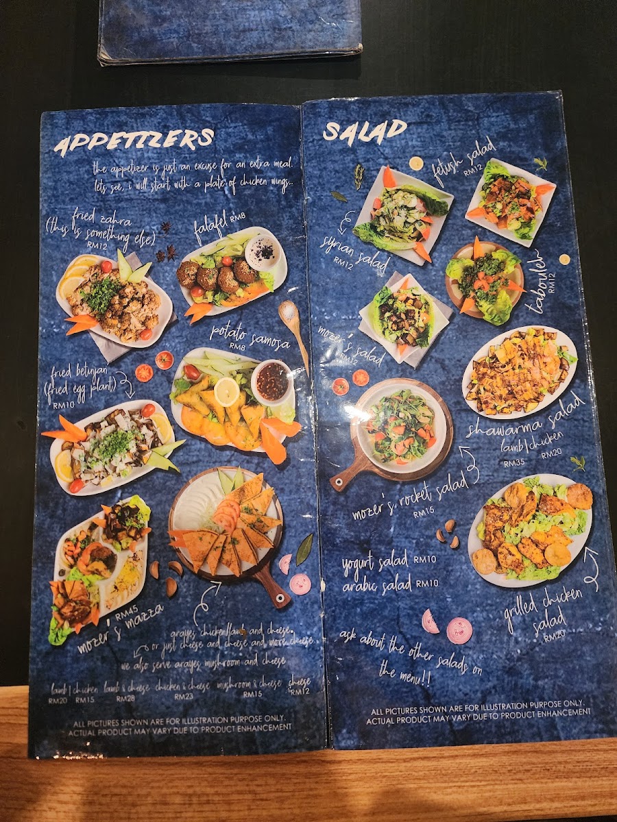 The menu at Mozer's @ Bukit Jelutong features a variety of traditional Syrian and Middle Eastern dishes, suitable for different mealtimes including breakfast, light bites, and main courses. The offerings include a range of appetizers, main dishes, desserts, and beverages that cater to diverse tastes.