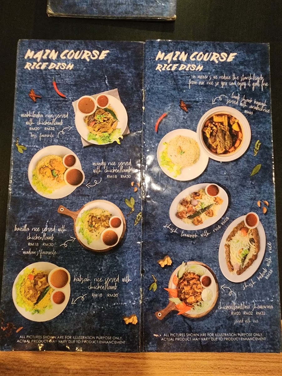 - Main Courses: Features lamb mandy, lamb shank kawajh, mandy lamb, chicken shawarma platter, makhlouba rice with chicken or lamb, and kabsah rice with lamb.
